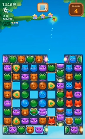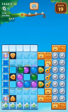 这一关需要你在26步之内消除134个冰块,开局时上方会有荷花苞,通过交换上方的动物进行三消可以快速消除荷花苞,从而释放出5只气鼓鱼到下方的位置。气鼓鱼出现之后,上方的炮台会被激活,接下来要利用炮台去攻击下层的那些气鼓鱼,这样就能收集到钥匙去打开宝箱了。宝箱开启后,整个局面会刷新出更多新的小动物,这为你消除了大部分雪块和障碍后,创造了更宽阔的操作空间和消除机会。