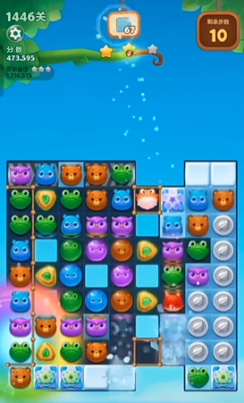 这一关真正的难点在于清除中间银币两旁的冰块,以及上方的冰块。对于中间的冰块,要优先寻找与该区域颜色相同的动物进行交换,利用动物掉落时的自然消除和连击来慢慢解决它们。而上方的冰块,可能在前期消除得不多,如果在小动物掉落过程中没有被顺带清理掉,就需要在后面步数不多时进行针对性消除了,但要特别注意不能浪费太多步数在这个地方。下方的雪块相对容易清除。